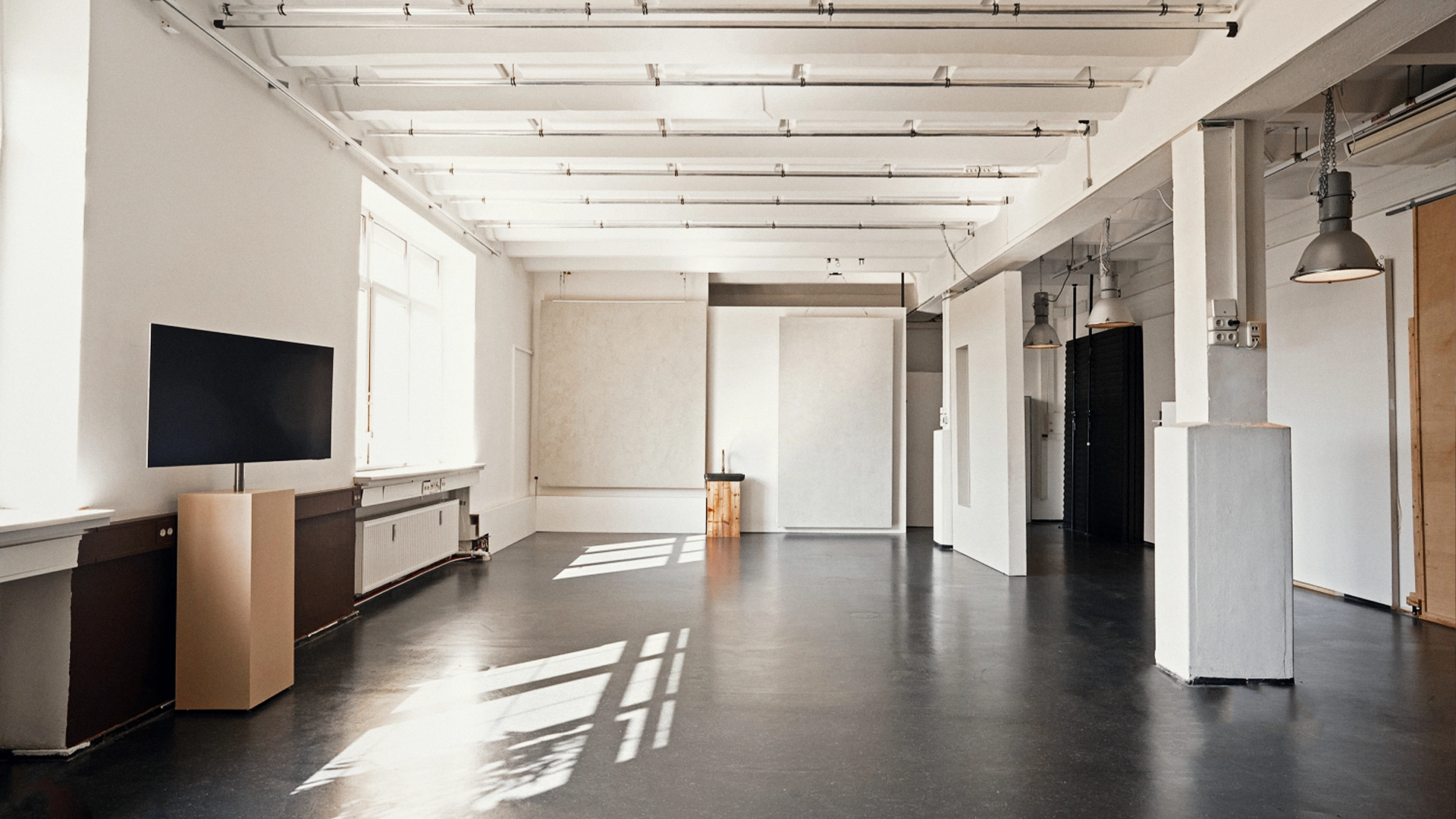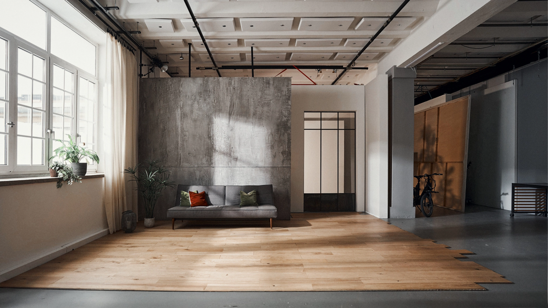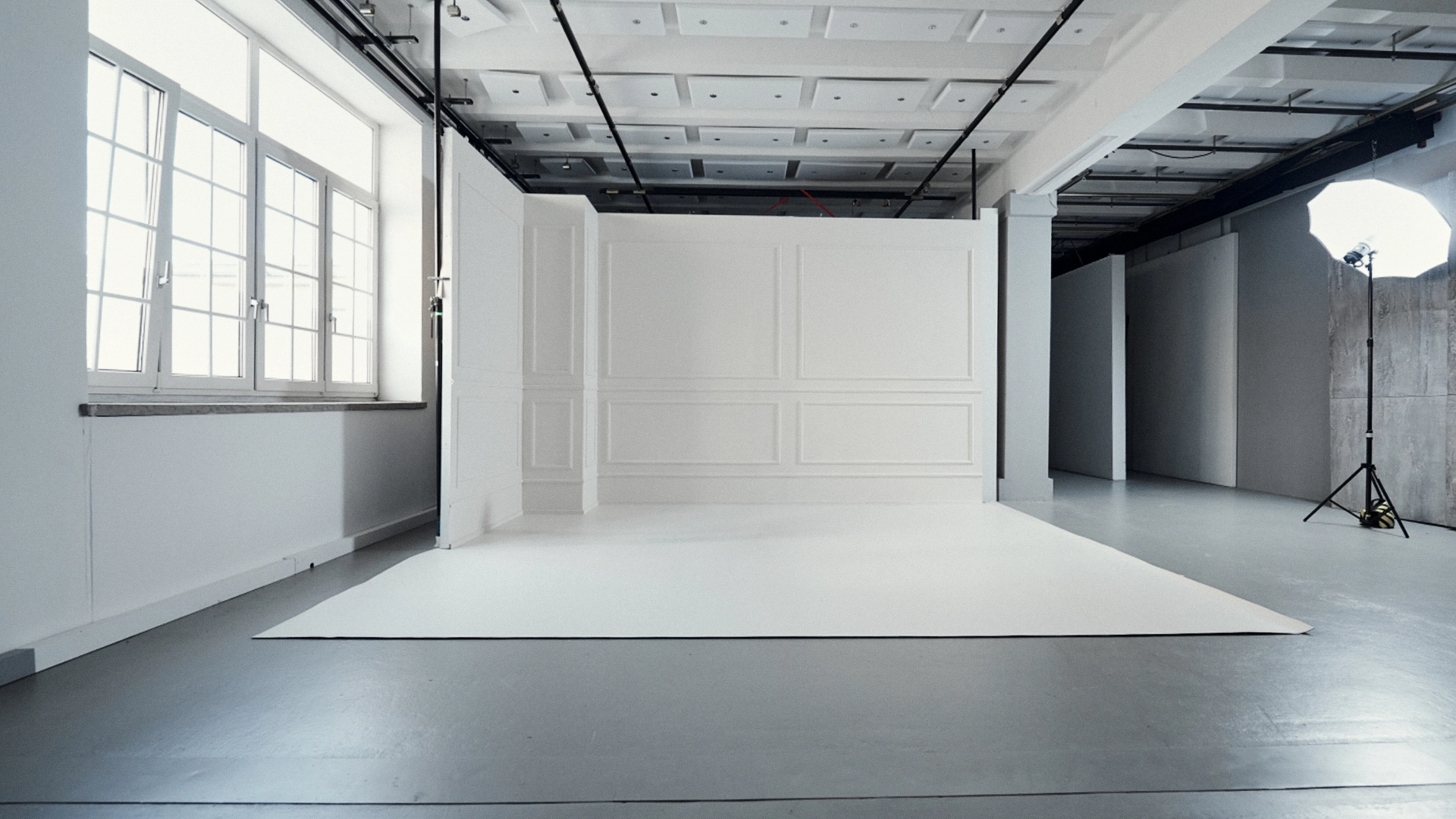 Studio 2 is a bright daylight studio with a north-facing window front that can also be fully darkened for controlled lighting. With a 4 m ceiling height and a flexible 115 m² layout, the space is ideal for photo and film productions of all sizes. The studio features strong 16A and 32A power connections, a ceiling rail system and the option for exterior lighting, making it highly adaptable for different visual setups. The grey industrial-style floor and modular wall elements offer creative freedom for larger set builds and custom layouts. A make-up and styling area can be added on request or combined with another studio for extended comfort. With high-speed Wi-Fi, a freight elevator, parking and a loading zone, Studio 2 provides a smooth and efficient workflow for any production.