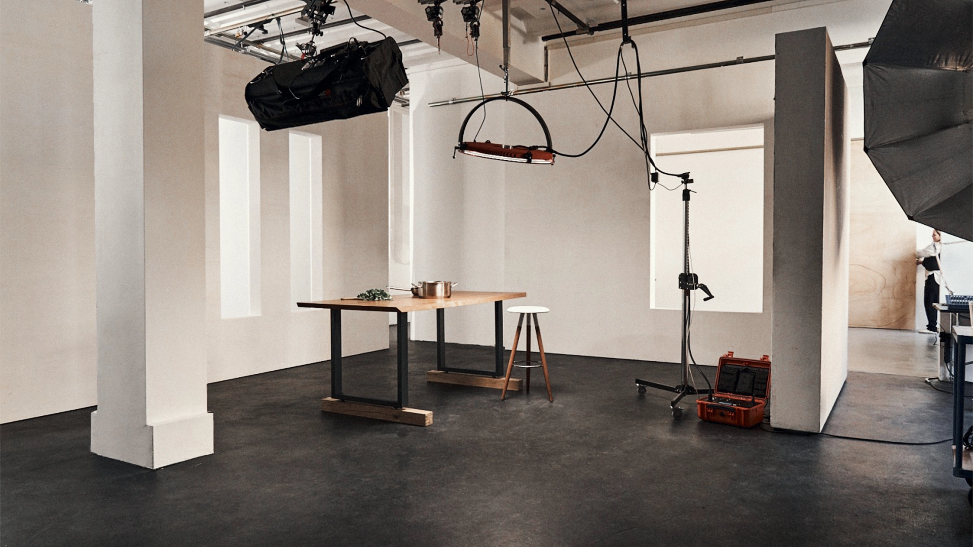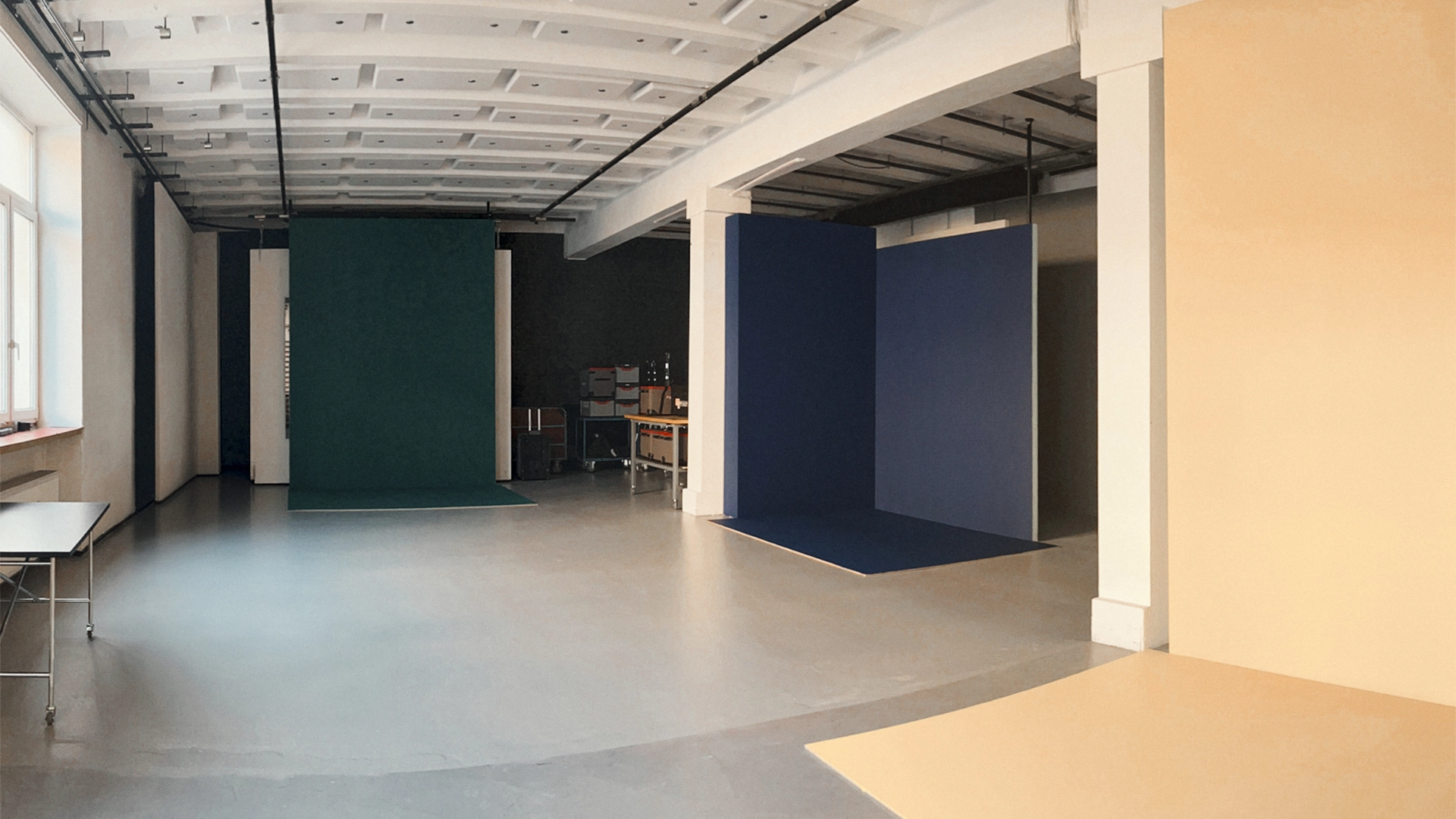This daylight studio features a north-facing window front and can be fully darkened when needed. With a ceiling height of 4.00 m and a total area of 115 m², expandable to 215 m² when combined with Studio 4, it offers generous space for a wide range of productions. The studio is equipped with 16A and 32A high-voltage power connections, a ceiling rail system and the option for exterior lighting. It is also suitable for original sound recording with prior notice. The space features a grey industrial loft floor, making it ideal for larger set constructions and ambitious creative concepts. Modular walls allow flexible room setups, while a make-up and styling area can be arranged on request or combined with another studio for extended comfort. High-speed Wi-Fi, a freight elevator, parking spaces and a loading zone ensure smooth production workflows and easy logistics throughout the day.